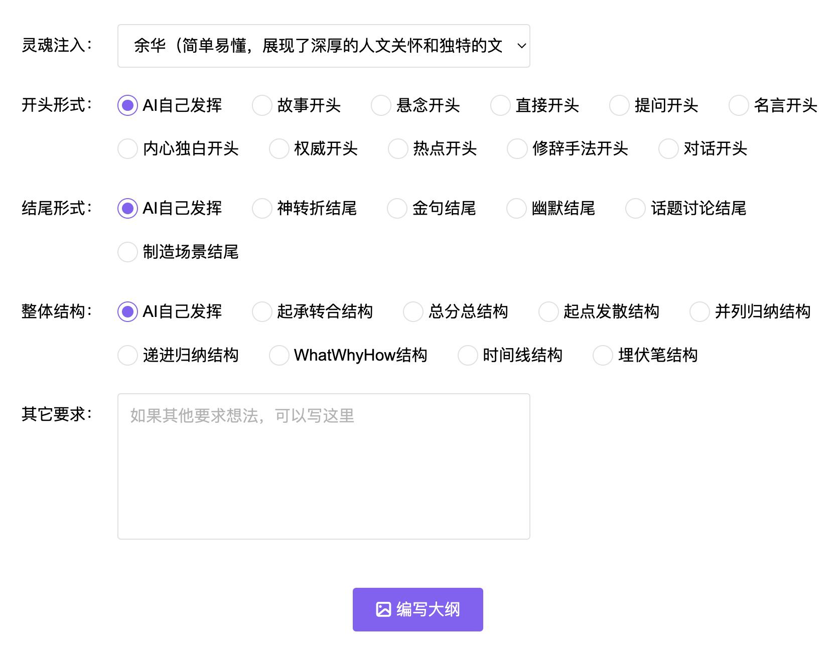 网站操作简单,可选择文章类型、框架、灵魂、自定义字数进行创作